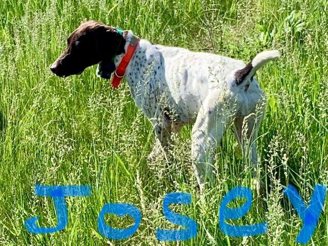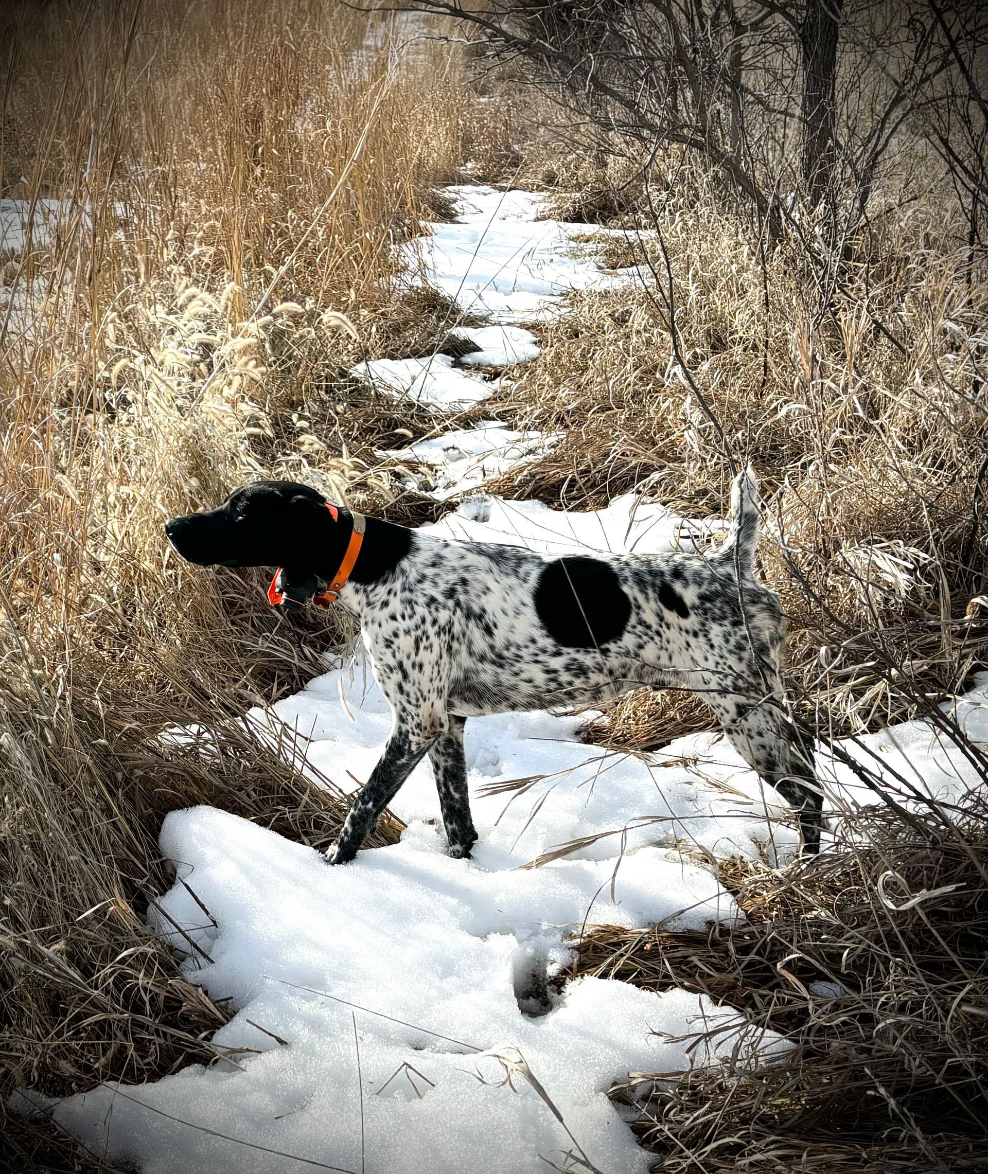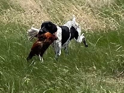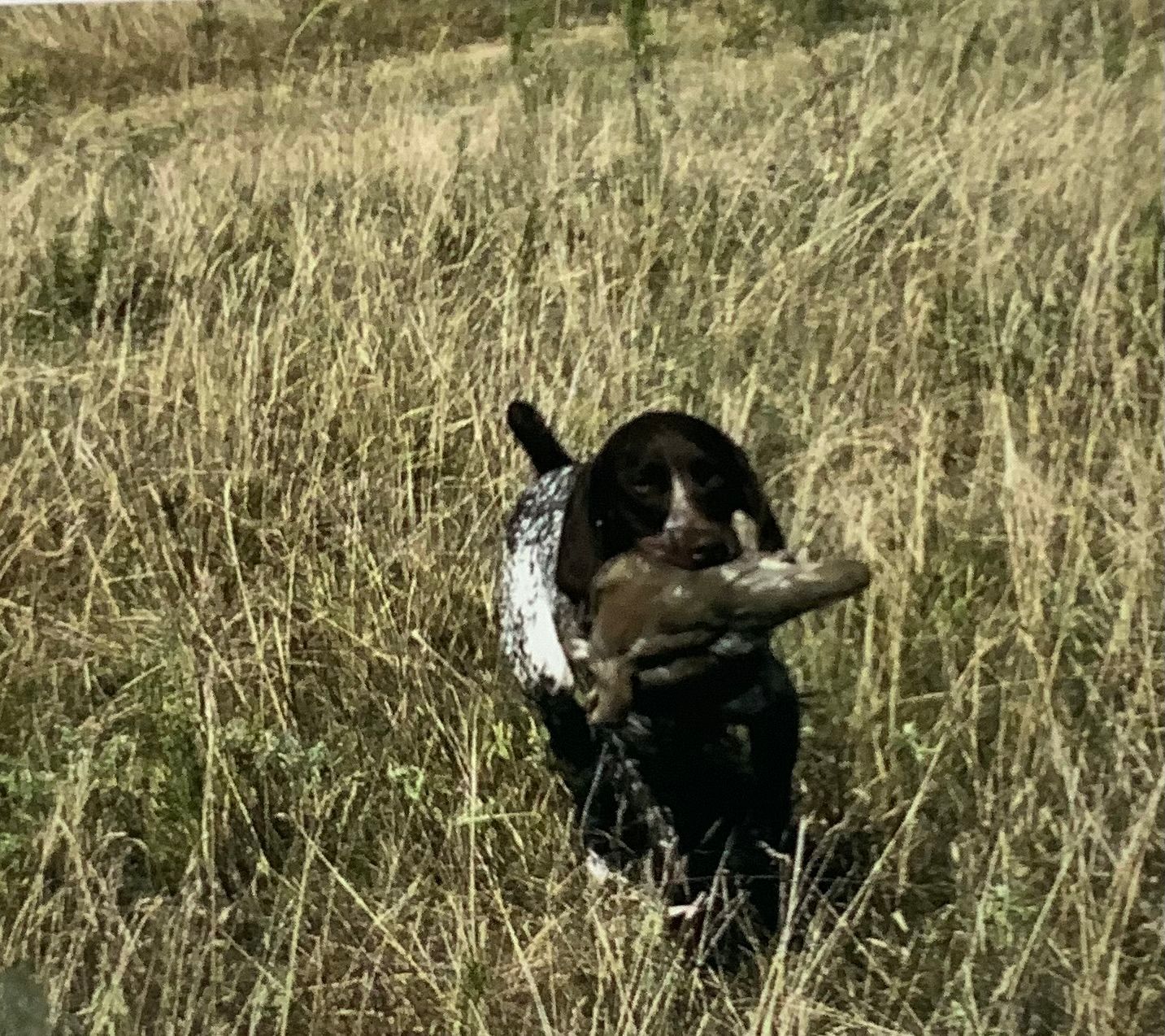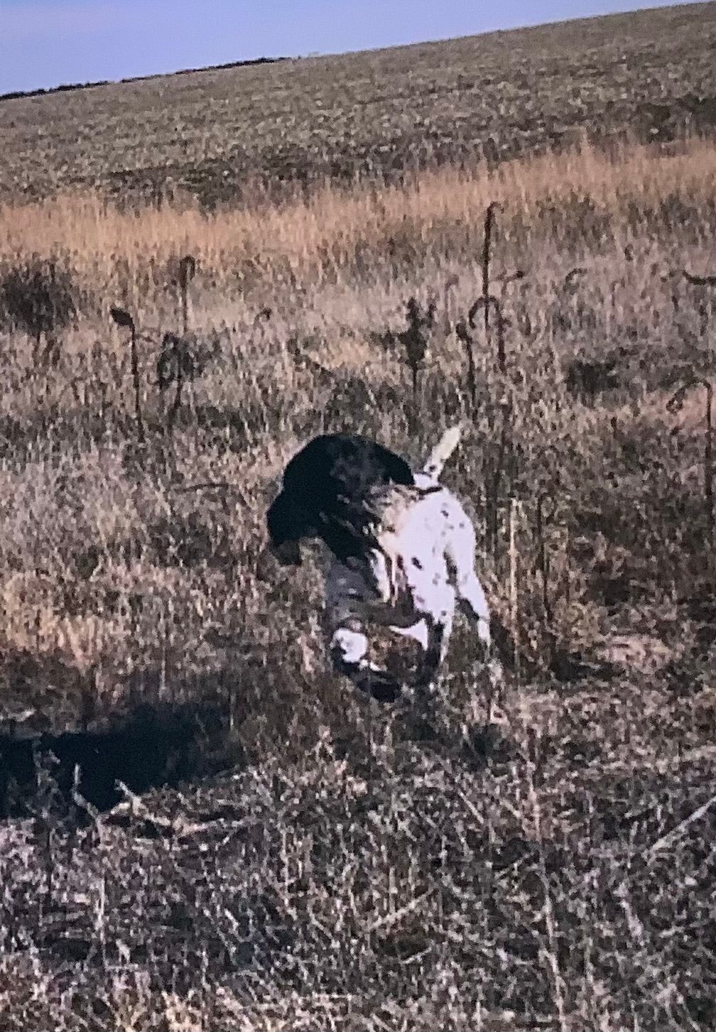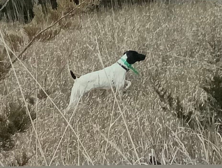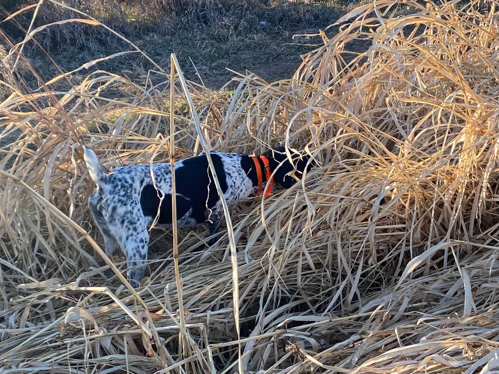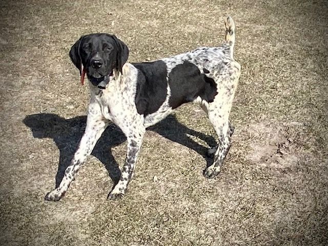 hard hunting male liver roan, solid on point, honors, loads retrieves land and water. Cate trained.