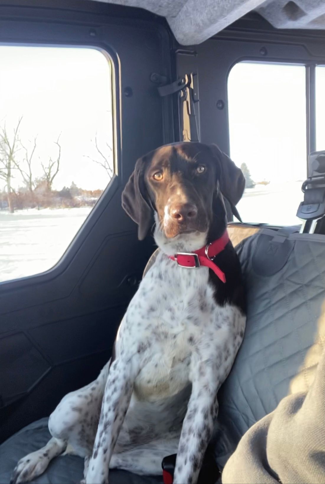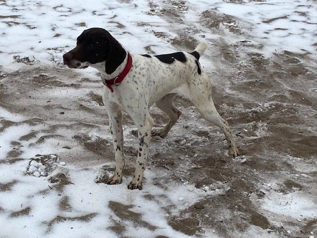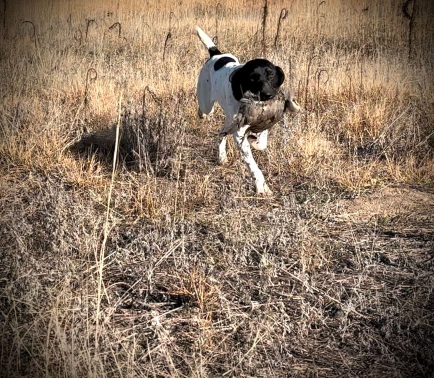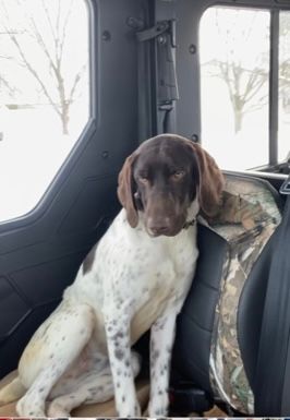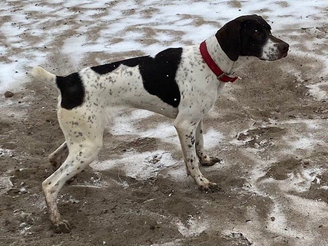 molly is a black white female, points, retrieves to hand, loads, whoa broke, crate trained. Very nice
