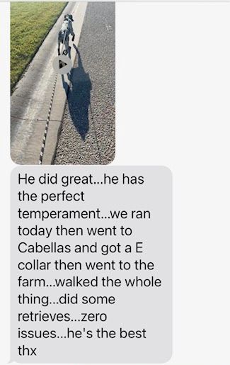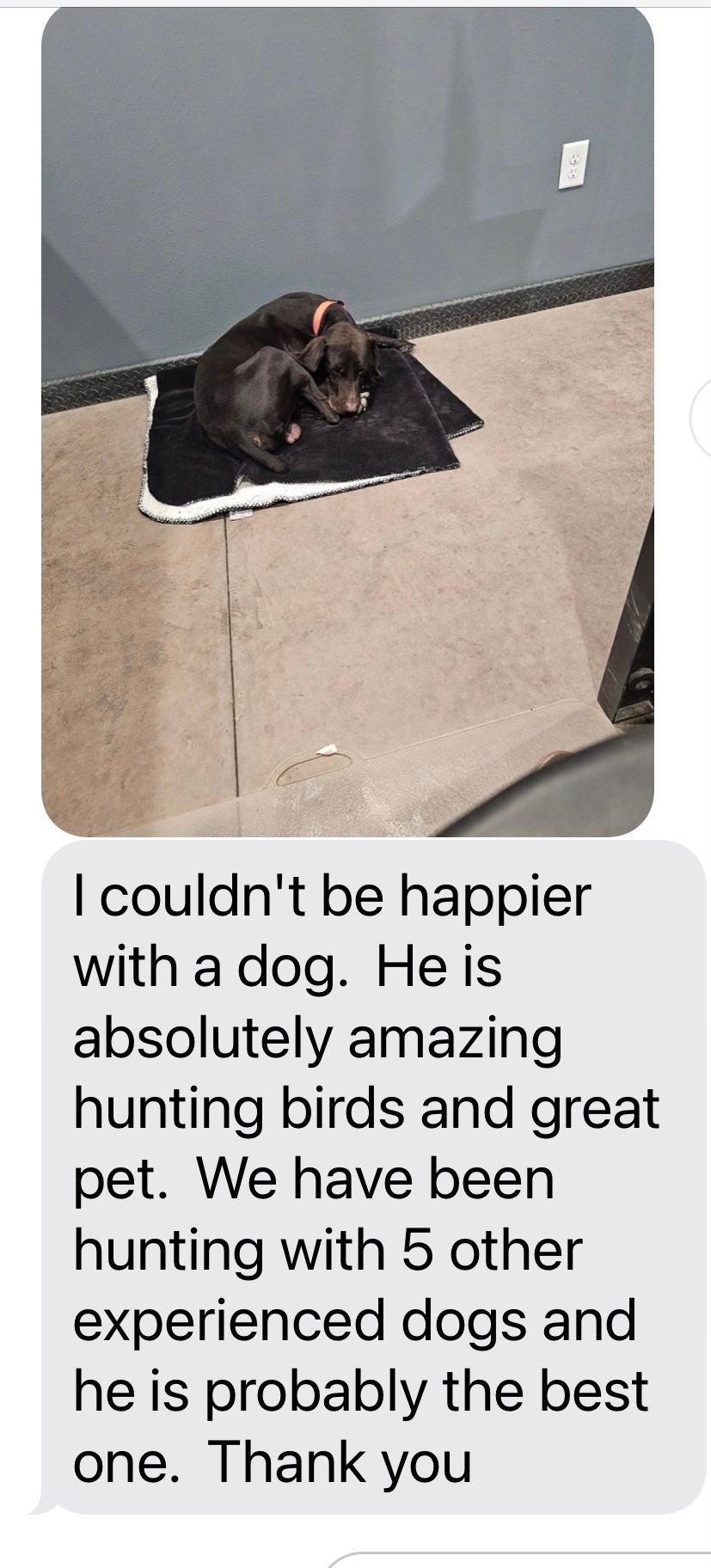 Never in my wildest dreams did I ever expect to have a dog of this caliber. He is the most amazing hunter.when we hunt with others champster always finds the birds.I can’t even tell you what a retriever he is. Gets better every time out. Last season in South Dakota there was a bird shot across a big pond. I looked over and champ jumped in and started swimming that was a first. Started crying like a baby I’m 69. Wounded birds are now a joy as long retrieves are just natural. He now sleeps in the master bedroom most mornings he is in bed with us.he is a strong athletic dog that never tires.the best part of our purchase was getting the videos showing us what he was learning.you can tell these dogs are loved.hard to wait to pick up.
